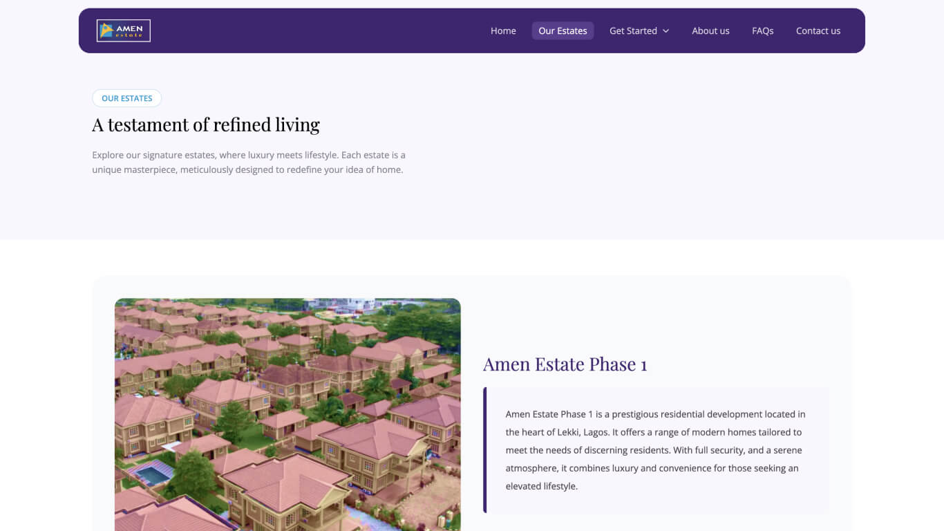 A website redesign for Amen Estate that allows potential customers to schedule inspections, contact the estate, book shortlets, and explore options for renting or buying. It offers a simple, responsive interface.