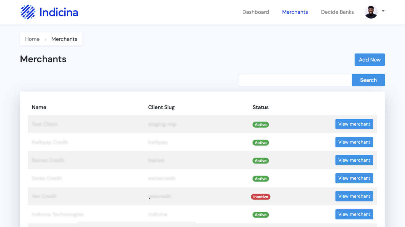 An internal portal for Indicina to efficiently onboard and manage merchants. It allows for the customization of merchant customer portals, facilitates billing, and manages various Indicina products, enhancing administrative efficiency